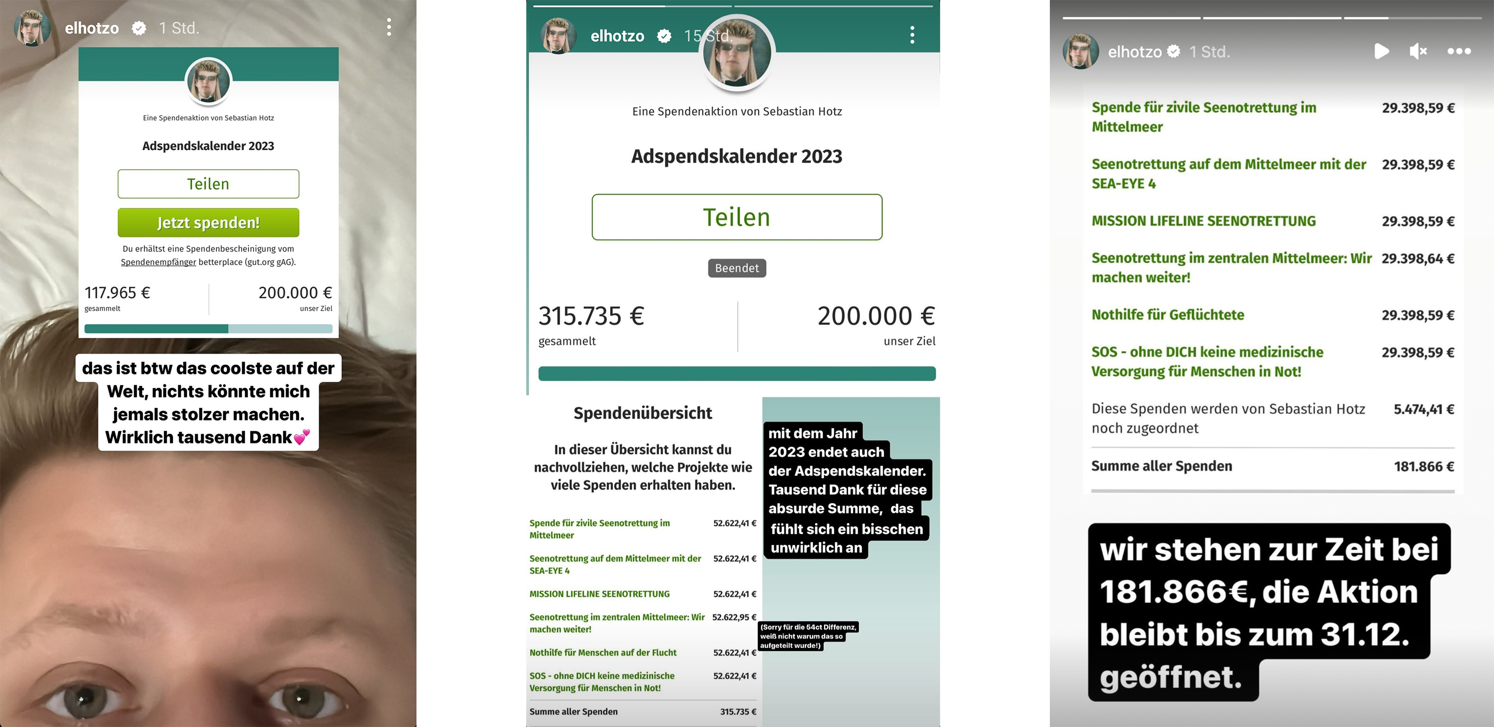 El Hotzo lenkt durch seine Spendenaktionen die Aufmerksamkeit auf drängende gesellschaftliche Themen und setzt sich mit seinem „Adspendskalender“ für Organisationen mit dem Schwerpunkt auf Seenotrettung ein. In seiner letzten Spendenaktion konnten so 316.000 € zustande kommen!