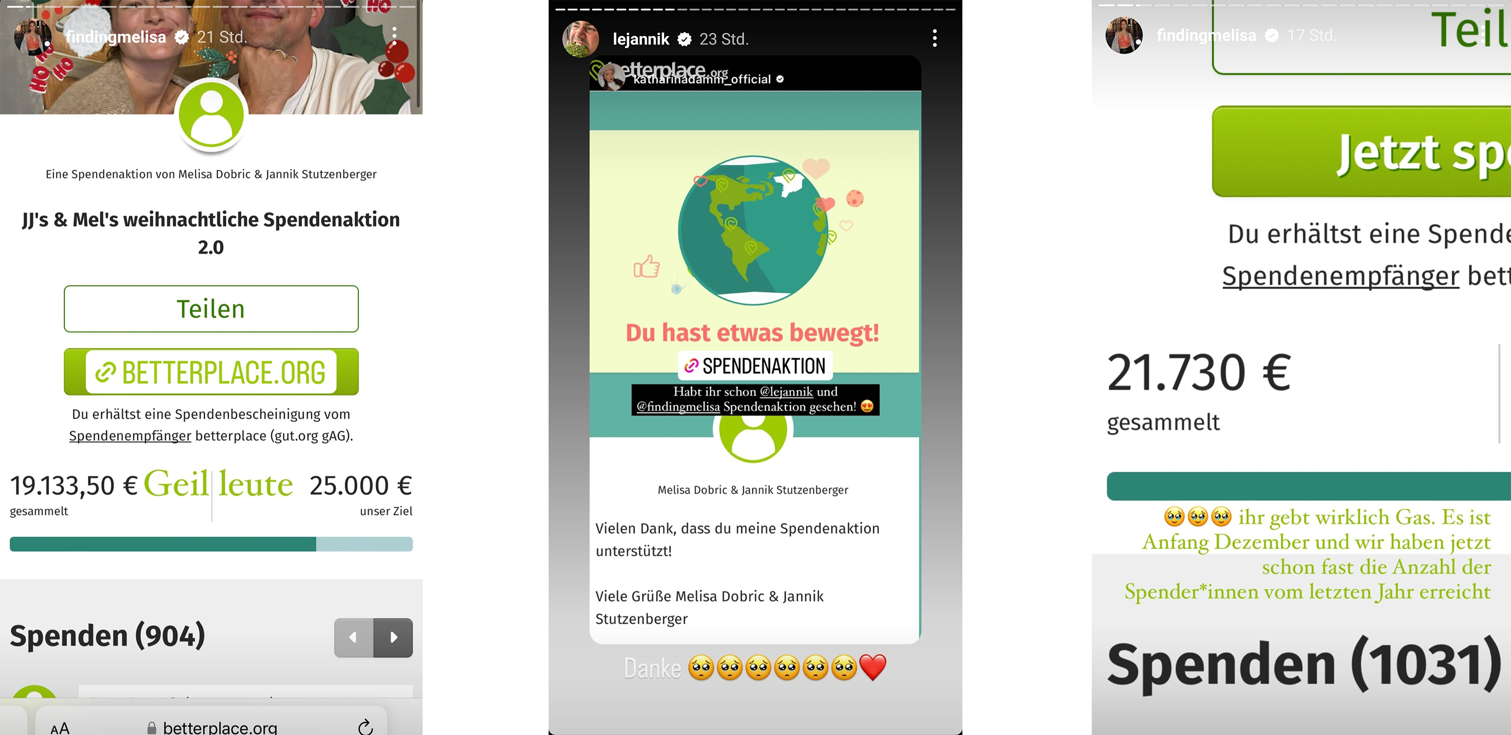 Melisa Dobrić sammelt schon seit 2021 gemeinsam mit ihrer Community Spenden für gemeinnützige Organisationen. Seit 2022 hatte sich ihr Jannik Stutzenberger angeschlossen – und vervielfachen damit die Spenden-Community für eine gemeinsame Spendenaktion! Dabei wählen beide jeweils 2 Organisationen aus, die die Spenden bekommen sollen.