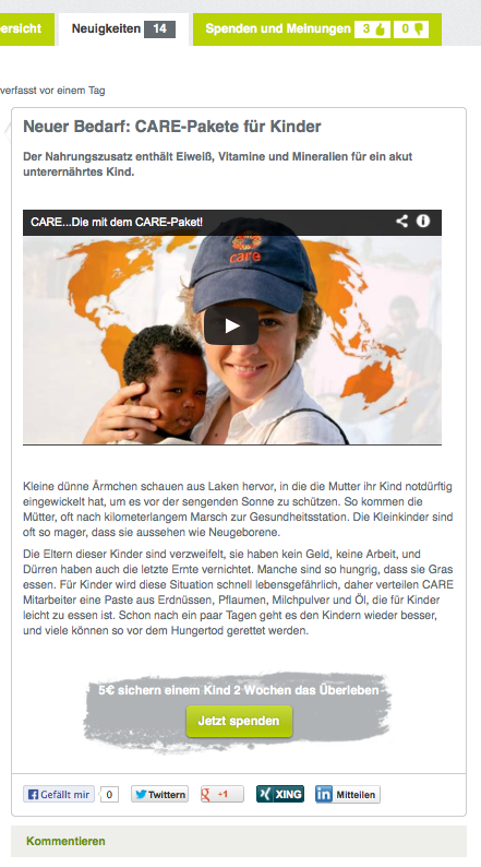 Informationen rund um diese Fragen sollen vom Projektverantwortlichen gegenüber seinen Spendern kontinuierlich kommuniziert werden. Aus diesem Grund verfügt jedes Projekt über einen eigenen Neuigkeiten-Bereich , auf dem aktuelle Informationen publik gemacht und verfolgt werden können. Dieser Bereich wurde von uns in den letzten Wochen überarbeitet, so dass die Neuigkeiten jetzt noch schöner gestaltet werden können: mit Fotos, Videos oder Buttons.