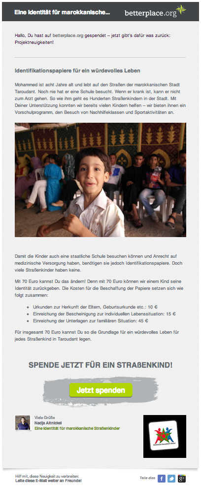 Zudem können Projektverantwortliche ab sofort auch per E-Mail die wichtigsten Neuigkeiten mit Ihren Unterstützern teilen, und diese zu weiteren Handlungen und Engagement aufzufordern! So haben sie die Möglichkeit, allen Spender durch **Versenden der Neuigkeit als Newsletter ** zu danken, diese am Fortschritt des Projekts teilhaben zu lassen und nachhaltig an ihre sozialen Aktivitäten zu binden. Automatisch versendete Benachrichtigungen über Einträge im Neuigkeiten-Bereich sind damit passé.