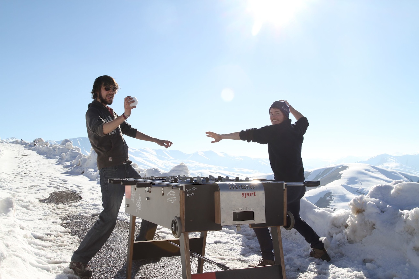 Und an fast allen anderen Orten, an die sie kamen, stellen sie ihren Kicker auf, um mit den Menschen in Kontakt zu kommen: im Schnee in den Bergen, am Strand in Kroatien, in der öden Wüstenregion an der Grenze zu Afghanistan und in jenem Slum, in dem der Film „Slumdog Millionaire“ gedreht wurde. Und es dauerte nie lange, bis sie umringt waren von Menschen. Es funktionierte eigentlich überall: In den Slums strömten Kinder heran, die beiden Deutschen kickerten gegen Mönche und sogar gegen die indische Kicker-Nationalmannschaft.