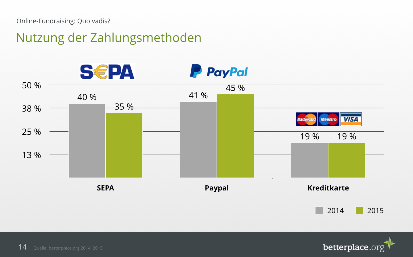 Wer auf Grundlage dieser Zahlen aber entscheidet bestimmte Zahlungsmethoden abzuschalten, ignoriert die Häufigkeit der Nutzung. Zwar liegt die Durchschnittsspende – wie aufgezeigt – bei Paypal unter der anderer Zahlungsmethoden, dafür ist sie weiterhin – zumindest auf betterplace.org – das beliebteste Zahlungsmittel. Ein Trend, der sich 2015 noch einmal beschleunigt hat: