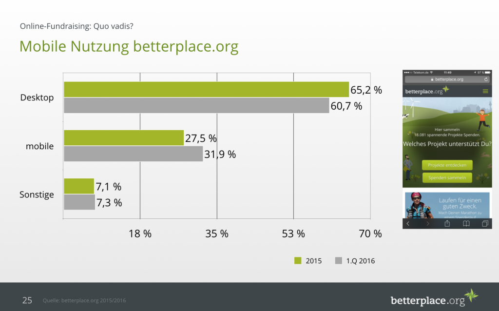 Die Conversion rate auf mobilen Endgeräten ist weiterhin deutlich schlechter als auf dem Desktop-PC. Gleichzeitig nimmt die mobile Nutzung weiterhin zu. Bei betterplace.org sind es kumuliert im 1. Quartal 2016 bereits fast 40% (sonstige umfasst insbesondere Tablets):