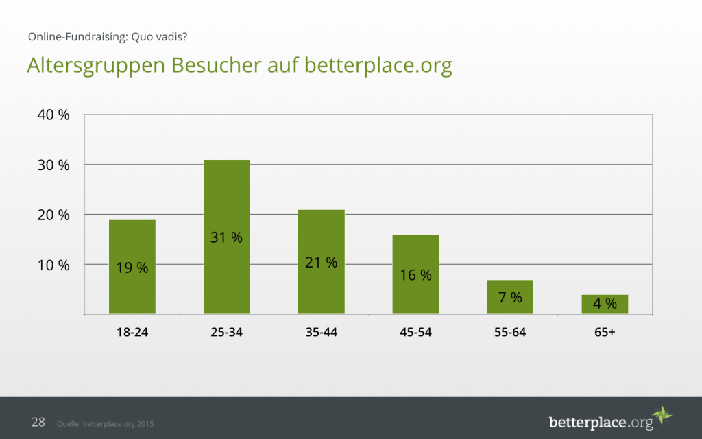 Stellt sich desweiteren die Frage, wer eigentlich die Menschen sind, die online spenden wollen. Nicht überraschend ist dies insbesondere die jüngere Generation der 25 bis 34jährigen. Doch auch die Gruppen zwischen 35 und 44 bzw. 45 bis 54 Jahre sind inzwischen stark vertreten. Vom Spendenvolumen her liegen sie bereits vorne: