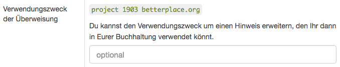 Immer wieder haben uns Fragen erreicht, ob man nicht den Verwendungszweck, der bei der Überweisung durch uns angegeben wird, selber gestalten kann. Hintergrund ist, dass gerade größeren Organisationen z. B. durch die Eingabe eigener Kostenstellen , einer Gruppennummer o. ä. die Buchhaltung erheblich erleichtert wird. Und genau das ist jetzt möglich. Bei jeder Auszahlung kann (optional) der Verwendungszweck um einen solchen Hinweis ergänzt werden.