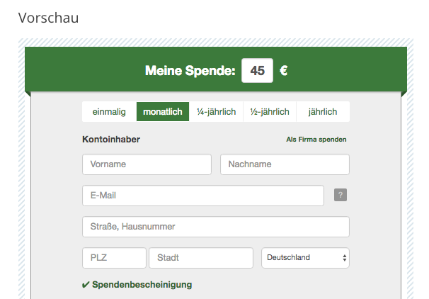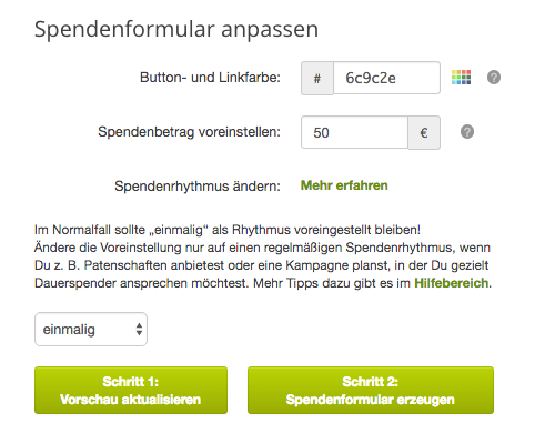 Aber jede Homepage ist anders. Daher ist es wichtig, dass das Formular individuell anpassbar ist. Das geht jetzt ganz schnell und einfach mit unserem Konfigurator! Dort kann der eigene Farbcode eingegeben oder der vorgeschlagene Spendenbetrag bzw. der Zahlungsrhythmus (einmalig, monatlich, vierteljährlich, halbjährlich, jährlich) bestimmt werden.