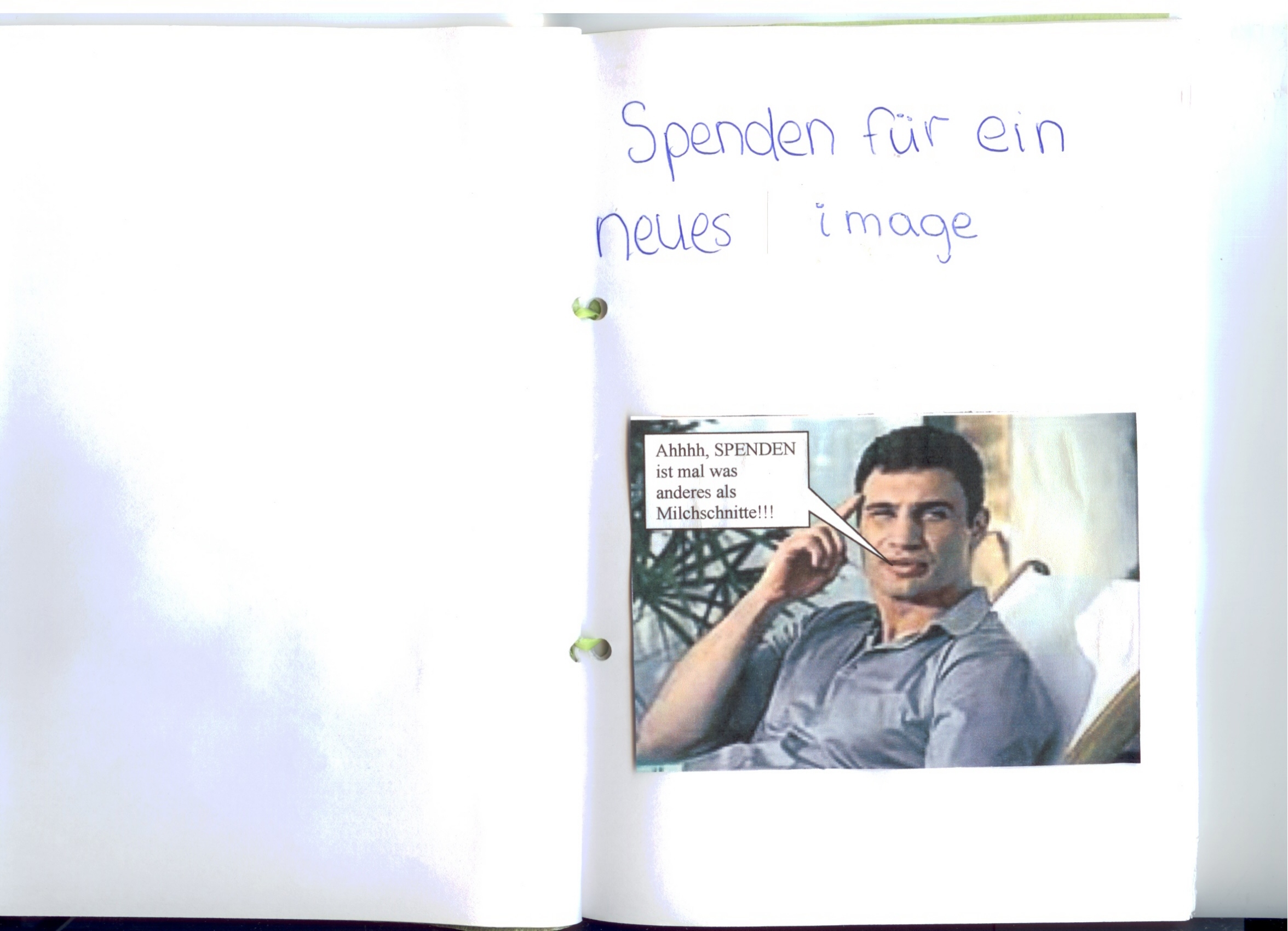 (Zu Weihnachten bekam ich von meinen Kindern ein betterplace-Buch “Charity goes personal”, in dem sich u.a. diese Collage fand: “Ah, SPENDEN ist mal was anderes als Milchschnitte”)