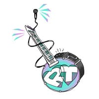 Drei fröhliche Personen heben die Hände, umgeben von Herzen und Konfetti.