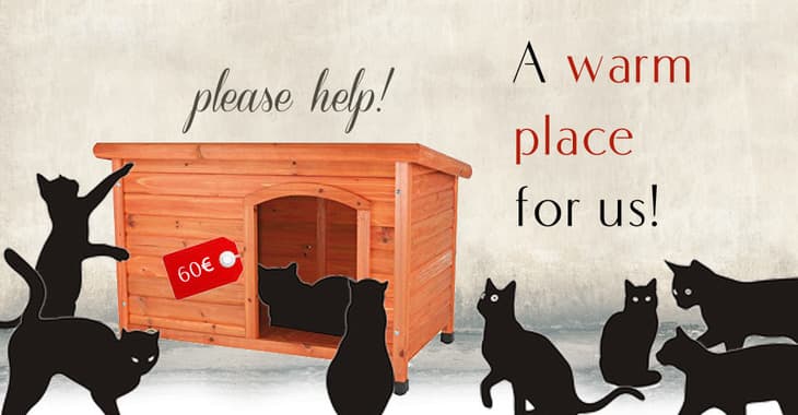 One or two days of rain and our self-made cat houses are dirty and numb. Also protecive adhesive film got loosen. Neighbours get annoyed about the boxes distrubes the picture. Now we are having the chance to buy stable wooden houses discounted at the sales. Already volunteers will be there to get them fixed together. Our minimum goal are 4 pieces, but we would be happy to reach more. These cathouses a perfect for the animals to withdraw. They are meat for long-life and they are waterproof. Moreover they are very suitable to easily put polystyrene boxes inside to protect the cats from the cold in the wintertime. Help to provide the cats a minimum of a home!