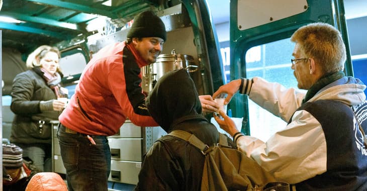 Der Hamburger Mitternachtsbus fährt täglich ab 20.00 Uhr in der Innenstadt zu den Schlafplätzen der Obdachlosen, den so genannten Platten. Ein Team aus Ehrenamtlichen bringt heiße Getränke, Brot, warme Decken und Kleidung. Vor allem aber bringen sie menschliche Wärme und Anteilnahme. Auf jeder Tour werden bis zu 160 Menschen erreicht.