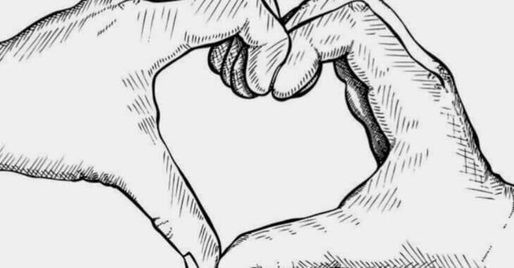 Drei fröhliche Personen heben die Hände, umgeben von Herzen und Konfetti.