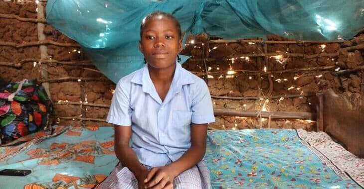 "Das ist die 12jährige Tunda. Tunda hat 7 Geschwister. Die Mutter kümmert sich allein um alle 8 Kinder. Der Vater ist vor 2 Jahren einfach verschwunden und hat sich nie wieder gemeldet. Tunda lebt derzeit in einer kleinen Lehmhütte - aber die Hütte ist zu klein und schützt nicht wirklich vor dem Wetter. Sie ist nicht stabil und es ist fraglich, ob sie die nächste Regenzeit übersteht. Eine neue, stabile, regenfeste Hütte wäre dringend nötig. Gerade bei einer so großen Familie, die in der kleinen Hütte kaum Platz findet.