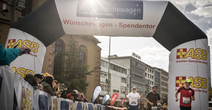 Daher besteht für unsere Teilnehmerinnen und Teilnehmer leider auch nicht wie sonst üblich die Möglichkeit durch das Spendentor unseres Charity-Partners, des ASB Landesverband Hessen e.V. zu laufen, das traditionell an der Hauptwache bei Kilometer 7,5 und 39 steht. Pro Durchlauf unterstützen die Läuferinnen und Läufer das Projekt „Der Wünschewagen – Letzte Wünsche wagen“ des ASB Hessen mit einer Spende von 4 Euro.