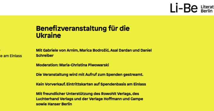 Die Veranstaltung findet am Sonntag, 24. April ab 19:00 Uhr im Literaturhaus Berlin statt und wird live auf dem YouTube-Kanal des Literaturhauses gestreamt.