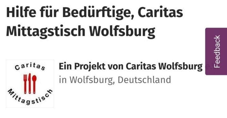 Wollen wir zusammen was richtig Gutes machen? Wie wäre es damit, gemeinsam über diese Spendenaktion „Hilfe für Bedürftige, Caritas Mittagstisch Wolfsburg“ von Caritas Wolfsburg e.V. zu unterstützen? Wir haben uns diese Organisation ausgesucht, da uns ihre Arbeit sehr am Herzen liegt. Sowohl wir als auch Caritas Wolfsburg e.V. freuen uns über deine Unterstützung, denn wirklich jeder Beitrag hilft!