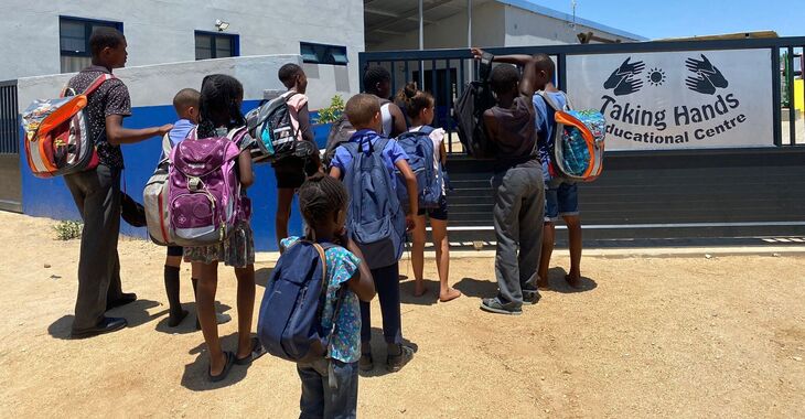 Nachmittags werden Schulkinder bei den Hausaufgaben unterstützt. Auch sie bekommen ein gesundes Mittagessen. So erhalten sie durch Bildung eine Chance auf ein Leben jenseits des Slum. 10 Mitarbeiter*innen aus Namibia und 2-4 Volontären aus Deutschland betreuen die Kinder . Neben der Vorbereitung auf die Schule erleben die Kids auch Sport, Kunst, Musik und Tanz bei uns. In einer Nähwerksatt können sie die Grundbegriffe des Nähens erlernen.