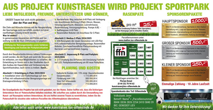 Der TuS Sillenstede e. V. wurde 1865 und bietet über 900 Mitgliedern die Ausübung Ihres Hobbys. Ca. 80 Ehrenamtliche sind mit unseren Mitgliedern sportlich aktiv in der Turnhalle Sillenstede und dem Sportplatz Jeversche Landstraße.