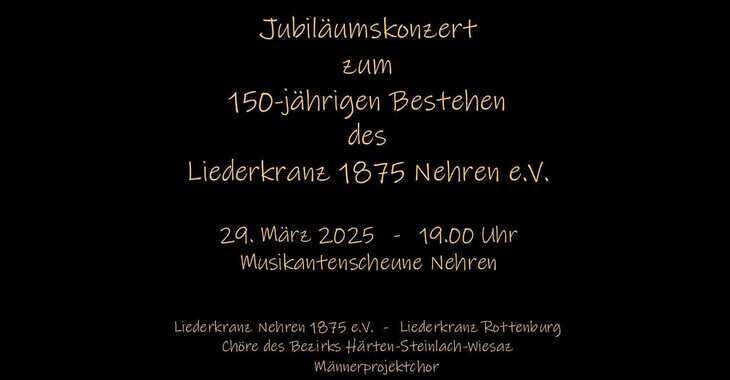 Der Liederkranz feiert sein 150-jähriges Jubiläum am 29.3.2025 in der Musikantenscheune in Nehen. Er hat für diese Veranstaltung, zu der ca. 300 - 350 Gäste erwartet werden, hohe Kosten für Musiker, Licht- und Tontechnik, Miete für die Location, Gastronomiekosten etc. zu leisten.
