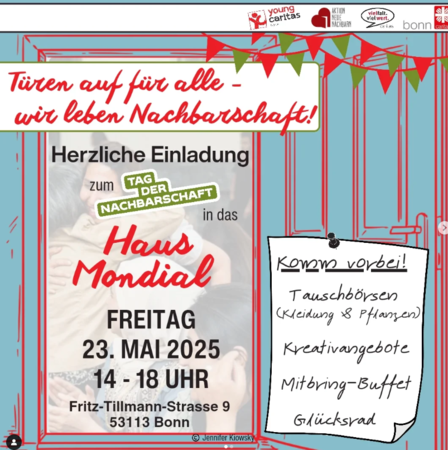 „Türen auf für alle – wir leben Nachbarschaft!“ +++ Einladung am 23. Mai 2025 von 14-18 Uhr ins Haus Mondial +++ Hilfen für Geflüchtete in Bonn
