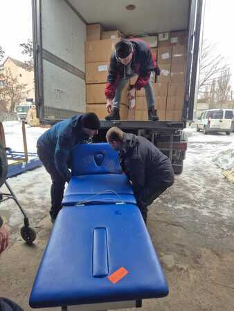 • 20. Februar: Komplettierung in Arnstein/Werneck Am darauffolgenden Tag wurde der LKW vervollständigt. Ein besonderes Highlight der Ladung ist ein kompletter OP-Tisch, der großzügig von dem Hausarzt Dr. Lauer aus Geroldshausen gespendet wurde.