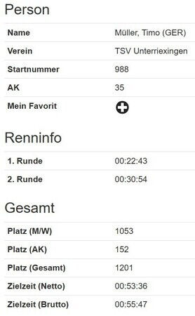Auch flott unterwegs war Timo Müller. Mit einer Zielzeiteit von 00:53:36 Minuten blieb er deutlich unter der 60 Minuten Marke und steuert so 8€ zum Spendenbeitrag bei.