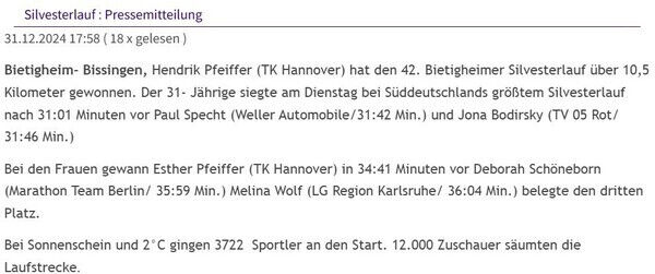 Bei einer Top Veranstaltung (Orga usw.) mit zahlreichen Zuschauern, wurden starke Zeiten der Teilnehmer beim Silvesterlauf in Bietigheim eingelaufen. Leider konnte Dr. A. Harder krankheitsbedingt nicht teilnehmen, gute Besserung auf diesem Wege Andi.