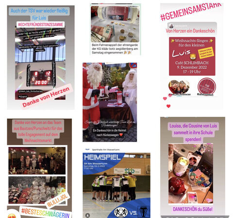 Wir hatten ja angedeutet vermehrt auch im Update über lokale Spendenaktionen zu berichten. Viele von euch sind hinter den Kulissen unterwegs und sind bspw. auf Weihnachtsmärkten, in Handballhallen, beim Fahnenappell oder weiteren coolen Events für Luis aktiv. Einige Highlights findet ihr hier in der Collage: