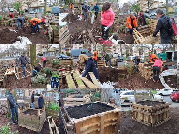 • Alles in Handarbeit: die Hochbeete, die Tische und Sitzbänke wurden aus alten Holzpaletten gebaut. Es wird von Hand gesät, gepflanzt, gemulcht, gegossen und gepflegt (selbstverständlich alles gift- und chemiefrei). Dies alles nachbarschaftlich selbst organisiert und freiwillig geleistet.