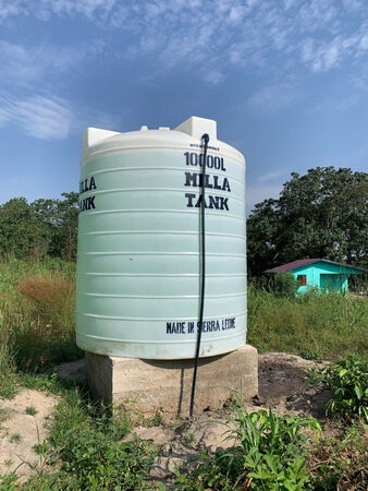 Das komplette Bewässerungssystem besteht natürlich nicht nur aus dem Tank: Auf unserem Verwaltungsgebäude im Bildhintergrund gibt es eine kleine Solaranlage, die die Pumpe am Brunnen unweit des Sumpfes betreibt. Von dort aus fließt das nährstoffreiche Wasser in den Tank und dann weiter über 100 Meter Schläuche direkt auf unsere kleinen Regenwaldriesen. Unsere Mitarbeitenden jubeln, endlich können die Gießkannen im Lagercontainer stehen bleiben ...