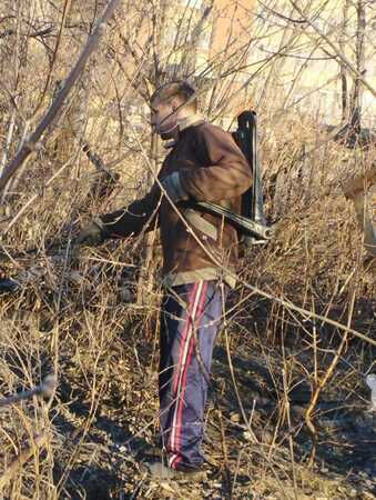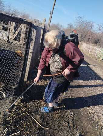 Und dann begannen wir, das Territorium zu bespritzen. Ich habe einige Grundstücke. Ausserdem muss man auch das Territorium rundherum bearbeiten. Die Zecken interessieren sich ja nicht, wer hier Eigentümer ist, sie kriechen überall und stechen. Es war schon ein langer Prozess. Mein Helfer Vitali hat damit angefangen. Aber er bekam dann Atrmprobleme und sein Gesicht brannte. Ich habe ihm eine Maske gekauft, aber das hat nicht geholfen. Es wurde ihm immer schlechter. Ich habe dann selbst gemacht. Ja. die Atemorgane fingen an, zu brennen. Aber das musste gemacht werden. Dann merkte ich den Sohn meiner Helferin Ljudmila. Er hatte einen freien Tag an seiner Arbeit und ich konnte ihn bitten, mir zu helfen. Für eine Flasche Bier hat er mir alle übriggebliebenen Grundstücke mit Zipermetrine bespritzt.