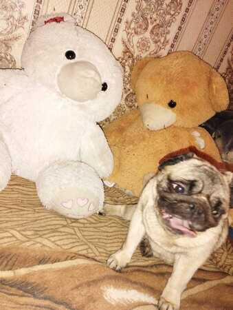 Bald habe ich verstanden, warum diesen leibevollen Mops niemand bei sich haben will: er ist krank. Er hat ernsthafte Probelme mit Darm, hat ständig Durchfall. Und er hat Schnupfen, entzündete Ohren und Augen... Er stank einfach schrecklich, als ich ihn zu mir nahm. Nun muss ich ihn behandlen. Er bekommt Antibiotika, Probitika, Augentropfen, Ohrentropfen, Vitamine, Diätnahrung und und... Am schwersten ist Diätnahrung, weil sie teuer ist und er nach anderem Futter wieder Durchfall bekommt.