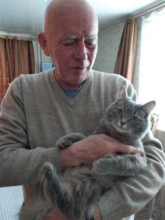 Und hier ist Katze Plucha mit ihrem neuen Papa im neuen Zuhause. Diese Katze verbrachte im TH nur eine Woche. Ihre