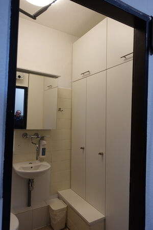 Angefangen haben wir damit einen passgenauen Schrank in das Erwachsenenbad einbauen zu lassen. Hier findet alles Platz, was nötig ist in einer Kita aber nicht wirklich schön (Putzmittel und solche Dinge).