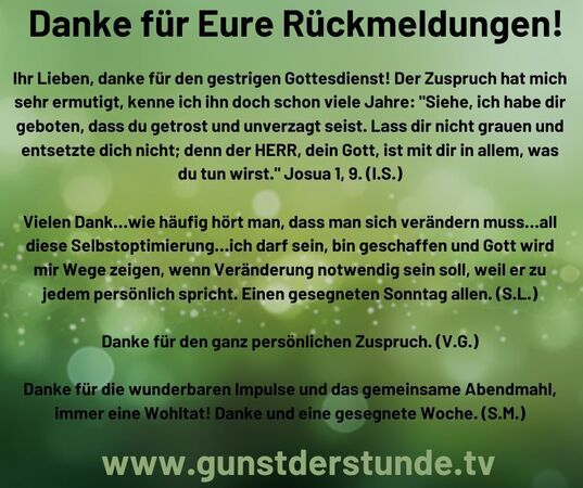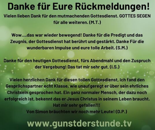 Wir stehen in der Gunst Gottes und das dürfen wir jeden Tag neu spüren. Eine große Freude und Ermutigung sind die Rückmeldungen, die wir von unseren Zuschauern zu den Gottesdiensten bekommen. Gerne lassen wir Sie daran teilhaben.