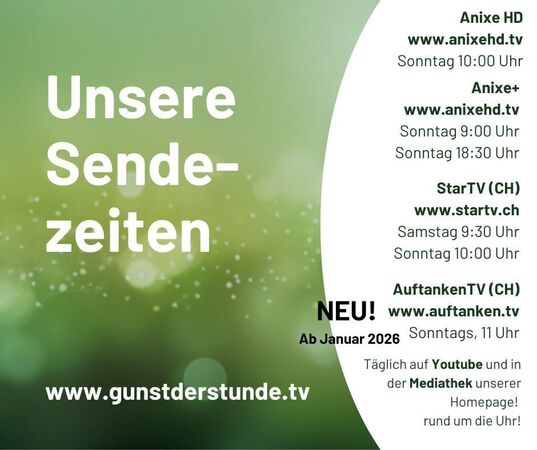 Mutig und mit viel Vertrauen starten wir in das neue Jahr. Im Januar und März sind neue Drehtermine geplant. Wir halten Sie auf dem Laufenden. Ebenso sind wir sehr dankbar für neue Sendezeiten.
