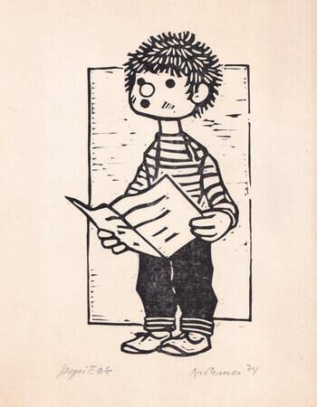 Bild/Linolschnitt: Pepíček liest Brundibár. Das Bild ist nicht aus dem Kinderbuch, es hat eine andere Geschichte, der wir auf der Spur sind.