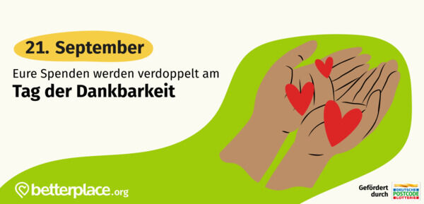 Am 21.09.2025 ist Tag der Dankbarkeit, und zu diesem Anlass verdoppelt Betterplace jede einzelne Spende über 50 €.