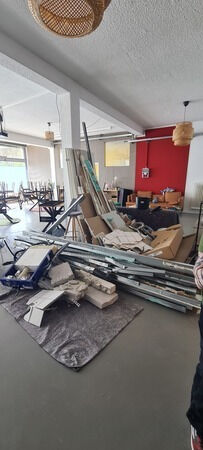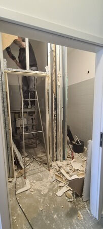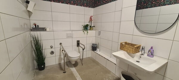 Dank einiger toller Helfer*innen konnten wir um Ostern herum die alten Sanitäranlagen abreißen und bis auf die Mauern zurückbauen, um neue barrierefreie Toiletten zu schaffen. Zwei wunderbare Profis haben uns dann geholfen den Rohbau aufzusetzen und aus dem kleinen Lager eine neue Toilette und aus ehemals zwei Räumen einen großen, barrierefreien Raum zu machen. Direkt danach haben fleißige Helfer*innen die Wände gefliest, verfugt und begonnen, die Wände zu tapezieren.