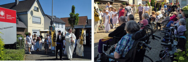 in der vergangenen Woche haben sich Bewohnerinnen und Bewohner des Altenheims Herz-Jesu-Kloster in Ramersdorf versammelt, um die Fronleichnamsprozession der Pfarrgemeinde willkommen zu heißen. Mit vertrauten Kirchenliedern stimmten sie sich gemeinsam mit Hausseelsorgerin Christel Fassian-Müller auf die Prozession ein. Pastor Norbert Grund und Kaplan Prince John erteilten den Segen mit dem eucharistischen Brot in der Monstranz. Die Kooperation mit der Pfarrgemeinde und die Pflege kirchlicher Rituale sind den Kolleginnen und Kollegen ein großes Anliegen.