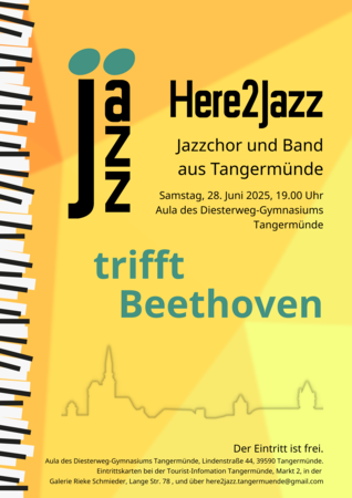 “Here2Jazz” Chor und Band verwandeln bekannte Beethoven-Stücke in Jazzmusik und präsentieren dabei eine Mischung aus Swing, Klezmer und Tango.  Die neue Serie bietet einen besonderen musikalischen Leckerbissen. Im Sommerkonzert des Tangermünder "Here2Jazz" Chors und Band werden bekannte Beethoven-Stücke in neue Jazz-Arrangements verwandelt. Besucher erwartet eine Mischung aus Swing, Klezmer und Tango, inspiriert von Beethovens Musik. Es gibt Bearbeitungen wie „Für Elise“ und der „Schicksalssinfonie“ sowie Interpretationen von Jazzgrößen. Das erste Konzert findet in der Aula des Diesterweg-Gymnasiums statt, der Eintritt ist frei. Karten sind in der Tourist-Information Tangermünde und der Galerie Rieke Schmieder erhältlich oder können per E-Mail vorbestellt werden. Aktuelle Hinweise zur Veranstaltung erfolgen über diesen Veranstaltungskalender.