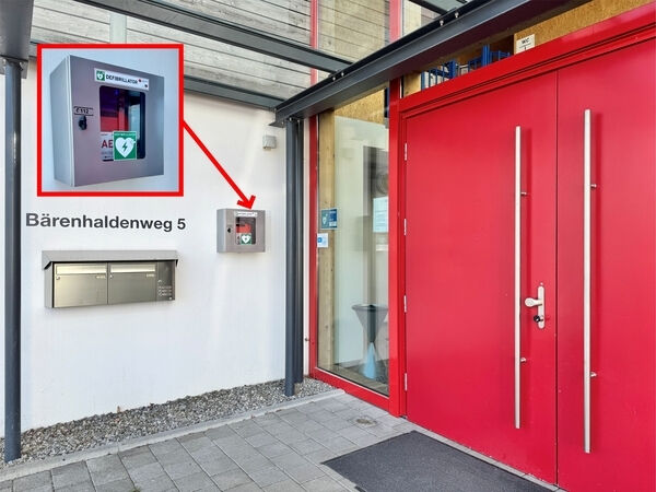 Inbetriebnahme eines Defibrillators am Haupteingang der TSV-Halle