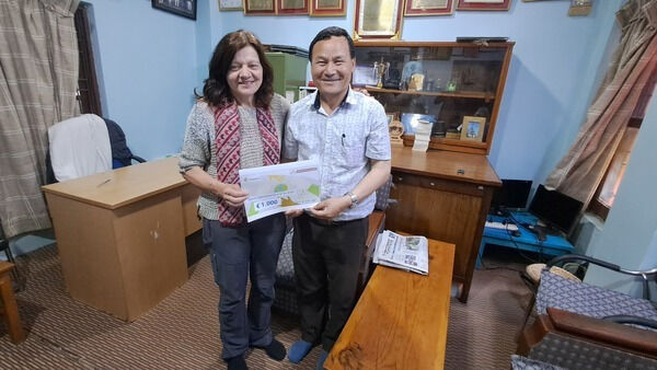 Das Jahr 2025 begann im Internat in Bungamati mit der Reparatur des Daches, welches bei den schweren Regenfällen im Herbst 2024 beschädigt wurde. Unterstützt wurde die Reparatur von der Stiftung „Umverteilen“, die 3000 Euro zur Verfügung stellte. Im März 2025 konnten sich Fura und Diki Sherpa (sie leben in Deutschland) bei einem Besuch den Stand der Bauarbeiten ansehen. Sie waren mehrmals in Bungamati um z.B. dringend benötigte Hilfsmittel für die blinden Kinder zu besorgen. So fehlte es zum Beispiel an Diktiergeräten und Taschenrechnern. Dafür erhielten wir eine Spende von 1000 Euro über die GLS-Dachstiftung, die wir bei unserem Besuch Anfang Juni übergaben. Die Freude war natürlich groß.