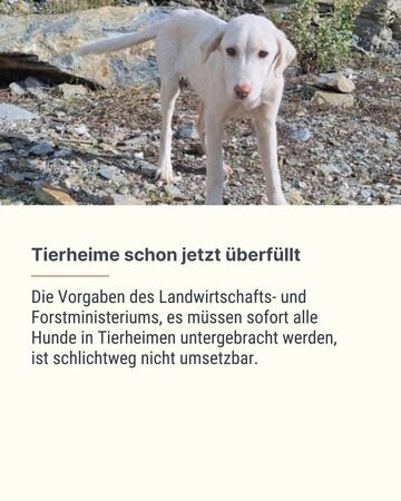 Das staatliche Tierheim, welches wir regelmäßig besuchen, ist bereits jetzt für ein viel zu großes Gebiet zuständig und hoffnungslos überfüllt, die Mitarbeitenden dort können nicht noch mehr leisten. Schon jetzt ist unter diesen überlasteten Bedingungen keine artgerechte Haltung möglich und die Leidtragenden sind am Ende die Tiere…