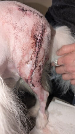 Dank eurer großartigen Unterstützung konnte Chip gestern eine entscheidende Operation überstehen. In einer vierstündigen OP wurde sein Bein um 2,8 cm verlängert, um beide wieder anzugleichen. Dabei wurde auch verändertes Gewebe entfernt und zur weiteren Untersuchung eingeschickt.