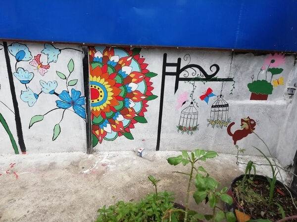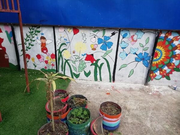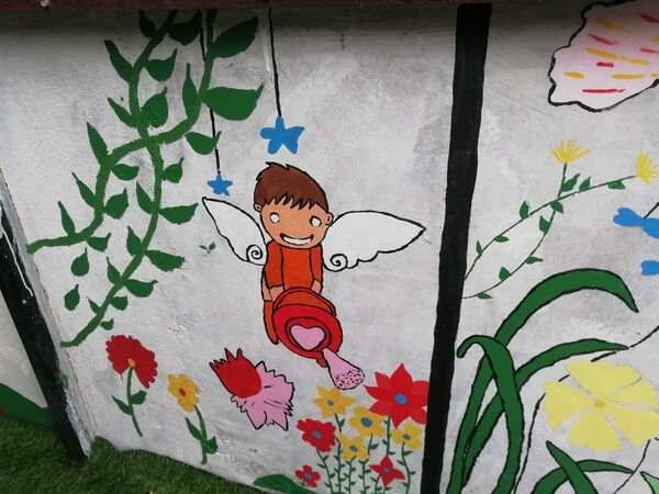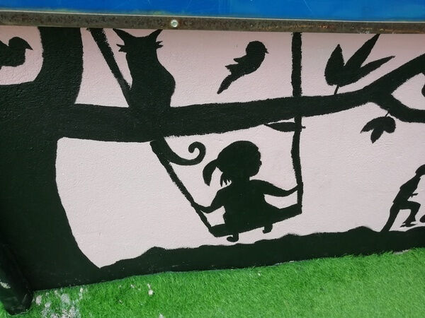 Erfreulicher Weise gehen auch immer wieder Spenden außerhalb der offiziellen Spendenaktionen von betterplace und WirWunder ein. Dieses Mal sind dabei sogar gleich 1.726,40 Euro zusammengekommen. Den Spendenden sei herzlich gedankt. Unser Dankeschön umfasst ein paar weitere Bilder von den Wänden im Hof unseres Kindergartens. Unsere Kinder werden durch die Bilder im Hof nicht nur zum Lesen, Schreiben und Rechnen angeregt, sondern sollen auch die Natur schätzen lernen. Diese Bilder befinden sich in der Ecke, in der auch ein paar ausgediente, bepflanzte Reifen liegen. Bild und Realität liegen also ganz nahe beieinander. Sich in der Natur aufzuhalten, ist auch entspannend. Dafür steht das Bild des schaukelnden Kindes als gemalter Scherenschnitt, das phantastisch in diese Idylle passt. Wir freuen uns auf weitere unvorhergesehene Spenden und danken schon im Voraus herzlich dafür.