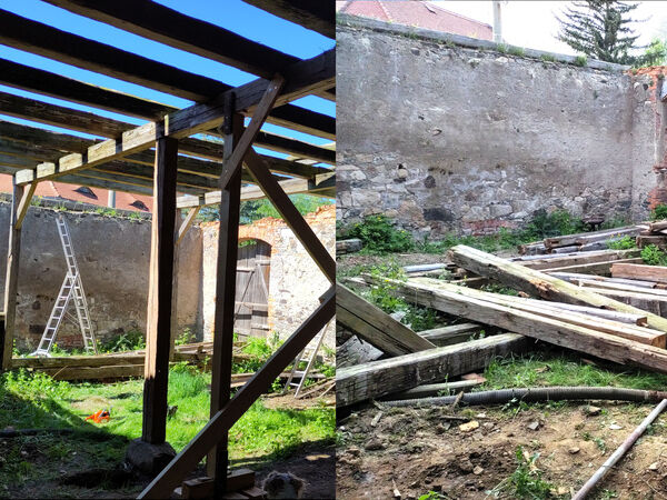 Der Zimmermann hat inzwischen die heilen Balken im eingestürzten Teil der Scheune abgestützt und gesichert, sodass wir die modrigen Balken, die mehrere Jahre Wind und Wetter ausgesetzt waren, absägen und ausbauen konnten. Damit ist jetzt Platz für den Bau der neuen Giebelverschalung.