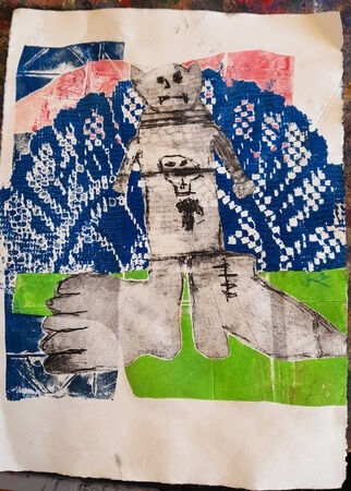 Die jüngsten Spendengelder werden wir einsetzen für Verbrauchsmaterialen (zum Beispiel Farben oder Ton) in unseren Kreativ- und Kunstwerkstätten, wo so wunderbare Werke entstehen wie auf dem beigefügten Bild aus der Druckwerkstatt.