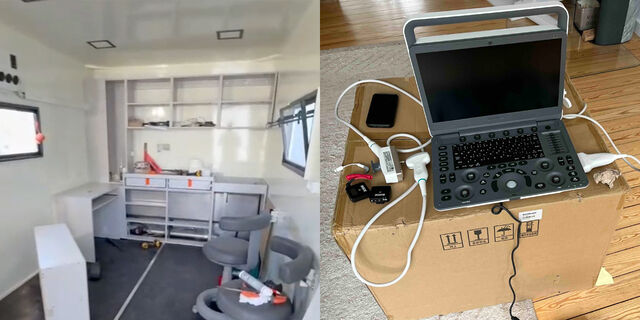 Der Aus- und Umbau erfolgte in den letzten Monaten in Warschau. Medizinische Geräte, wie ein modernes portables Ultraschallgerät, konnten wir von den Spendengeldern erwerben. Der Innenausbau ist jetzt fertig. Über eine Treppe gelangt man in einen kleinen Vorraum und steht dann in einem modernen Behandlungszimmer: eine richtige Arztpraxis, aber auf 4 Rädern.