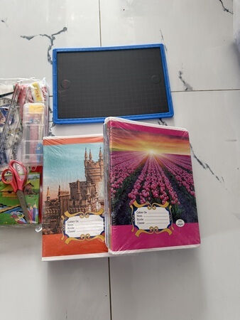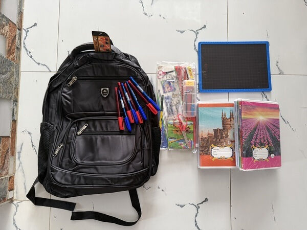 - ein Set mit Linealen, eine großen Schere, eine kleine Schere, Geodreieck, Zirkel, Messstab, ein großer Bleistift (in Senegal-Farben), 12 Buntstiften, Radiergummi, kleine Bleistifte, Anspitzer