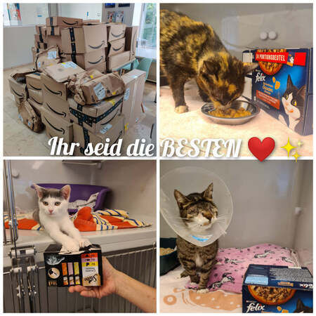 "!HERZLICHEN DANK AN DIE BESTE COMMUNITY! Wow! Ihr Lieben, wir sind sprachlos! Große Kartons ragen in die Höhe... vollgepackt mit euren Spenden! Ihr habt uns gestern und heute mit eurem Engagement und den unzähligen Futterspenden so glücklich gemacht! Unsere Samtpfoten riesig über die gewohnten Mahlzeiten- wie man auf den Bildern unschwer erkennen kann. Ihr erleichtert uns mit eurem Einsatz den manchmal doch sehr nervenaufreibenden und anstrengenden Arbeitsalltag in den (gerade überfüllten) Katzenhäusern. Wir freuen uns über jede einzelne Spende und bedanken uns von Herzen bei den TierfreundInnen, allen SpenderInnen und Beteiligten! Hut ab!"